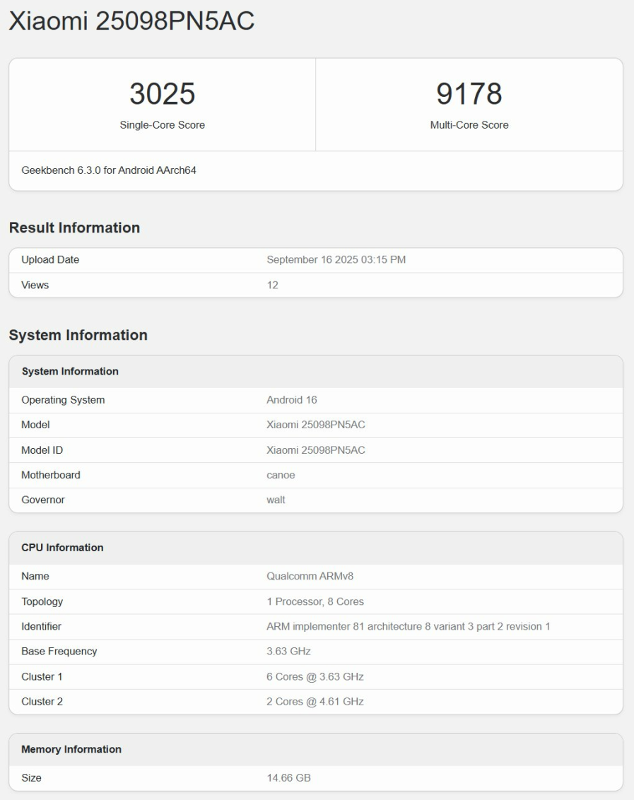 Также в базе Geekbench появились карточки Xiaomi 17 (25113PN0EC) и 17 Pro (25098PN5AC). Первый набрал 3156/9254 балла, второй — 3025/9178 баллов. На скриншотах видно, что оба тестовых смартфона получили Android 16, 14,66 ГБ ОЗУ (16 ГБ) и процессор с двумя кластерами: на шесть ядер (3,63 ГГц) и два ядра (4,61 ГГц).